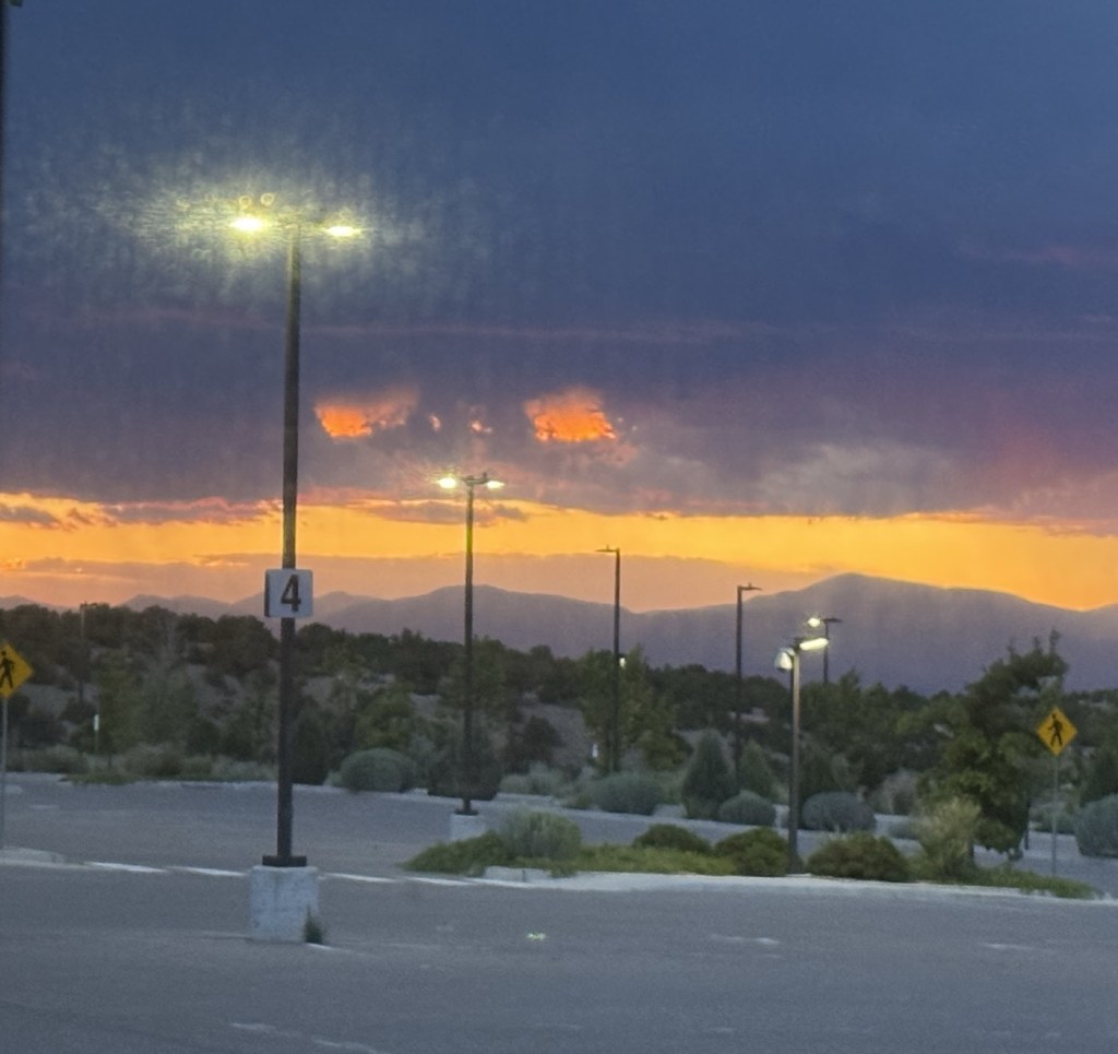 Storms over Santa Fe, New Mexico are other worldly. We’re boondocking in our RV in the parking lot of the Tesuque Pueblo Casino. The orange squares you see actually opened up in the cloud wall to show the fiery sunset behind the storm. The mouth shaped cloud below the eyes also occurred naturally. You can probably tell from the window dirt overlay that I took this pic from inside my coach. For Aunt Saffi, this could be nothing less than a sign that something wicked is on its way. The closest I’ve seen of that so far is over-roasted coffee. Still on the hunt for a good coffee in town. Truly tragic.