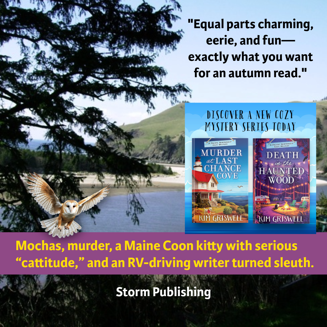Kim Griswell’s debut cozy mystery series from Storm Publishing features a best-selling author who lives and writes in an RV and travels the highways and byways of the Pacific Northwest. If you love small town coastal charm, clever women of a certain age, quirky characters, and a dose of murder, this one’s for you!